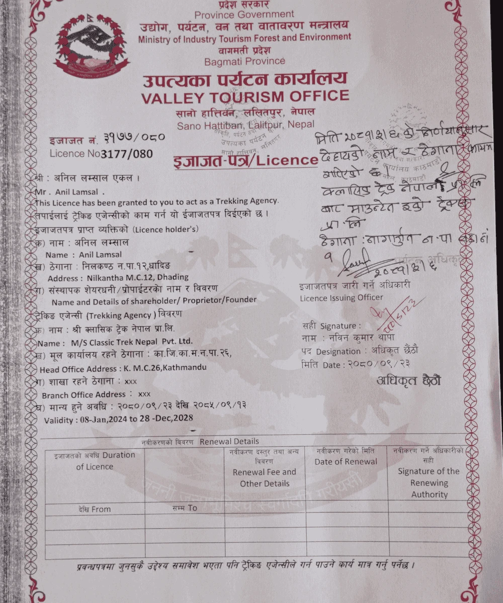 Check the legal documents of Mountain Eco Trails. Our company is registered with the Government Company Registrar, Tax office, Small cottage industry, and Valley Tourism Board of Nepal.